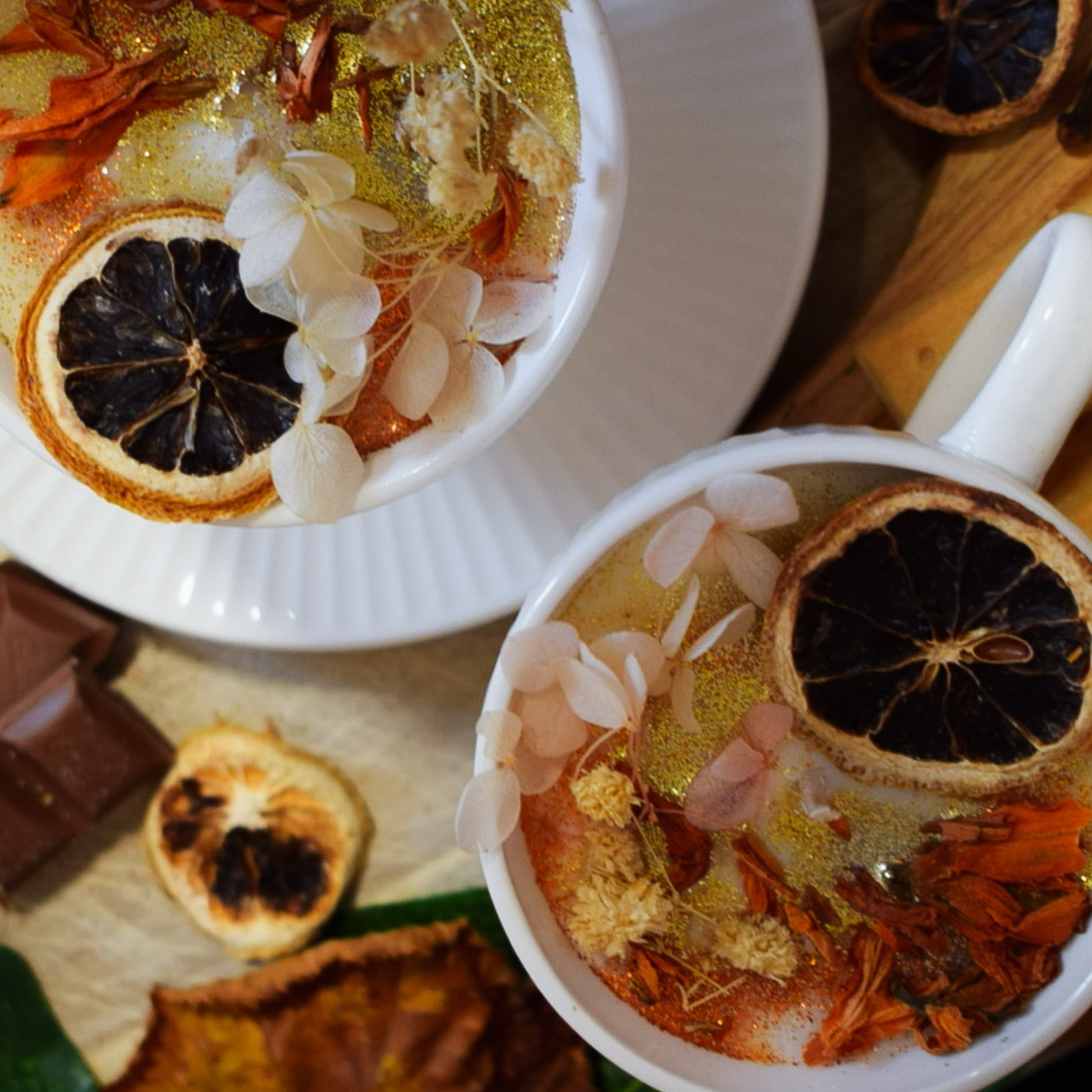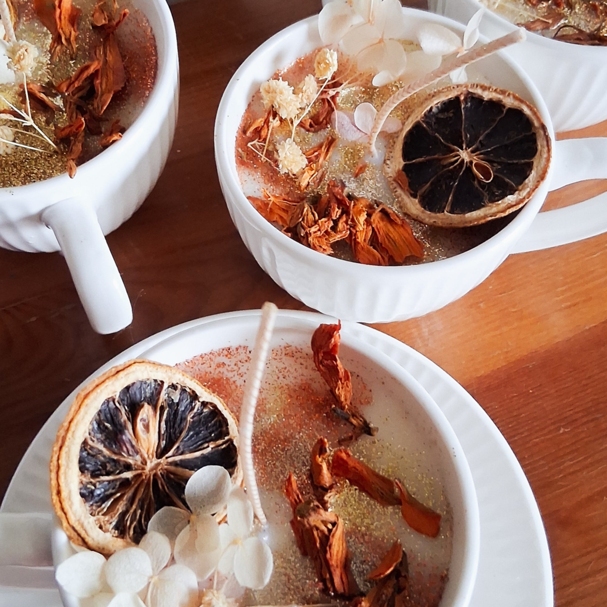 Some candles are meant to be saved forever and this one is meant for exactly this. Decorated with dried flowers including orange Lilly flowers, glitter and a slice of dried orange, this candle will cosy up any space and last for years (unless you choose to burn it of course!)